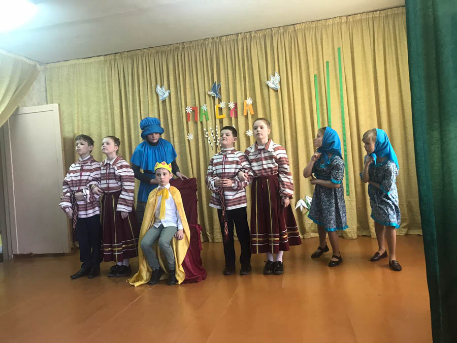 30 апреля для участников районного этапа олимпиады по основам православной культуры, а так же для воспитанников Воскресных школ благочиния и ребят, посещающих факультатив «Основы духовно-нравственной культуры и патриотизма», участники детского театрального коллектива «Вдохновение» по руководством педагога дополнительного образования Костюченко Натальи Владимировны Лоевского районного центра творчества детей и молодежи подготовили театрализованное представление «Как Царь добро искал». Маленькие артисты смогли создать по-настоящему атмосферу Пасхальной радости, благодаря которой каждый из присутствующих смог еще и еще раз поразмышлять над своими поступками и окунуться в атмосферу детской искренности и веры.