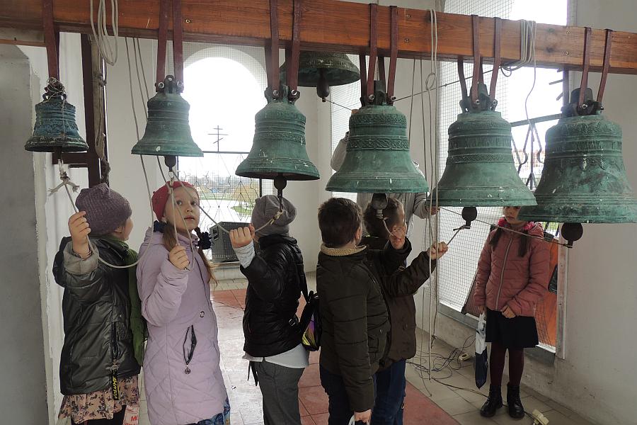 Светлая седмица – единственная в году, когда по Уставу церкви на колокольню разрешается подниматься всем желающим позвонить в колокола. Дети с удовольствием воспользовались возможностью самим позвонить в колокола. Вид храма и окрестностей с высоты птичьего полета произвел на них большое впечатление. Дети с удовольствием учили звоны и пробовали исполнять их, ведь именно в эти дни звон колоколов получается очень красивым.