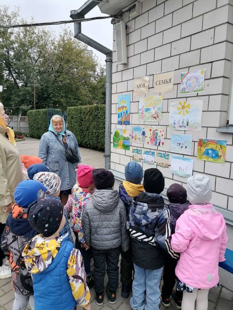 Детей у входа в храм встретила Ребенок Валентина, координатор храма. Она провела ребят по территории, рассказала об истории храма, о назначении главных его частей, занятиях воскресной школы при храме, обратила внимание на рисунки детей этой школы, посвящённые семье.