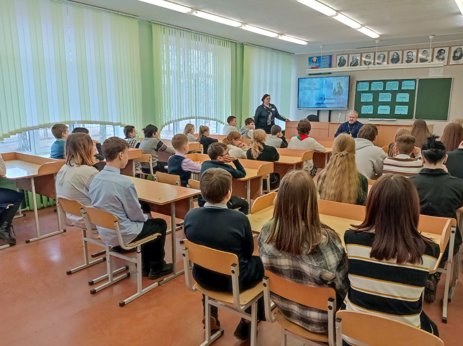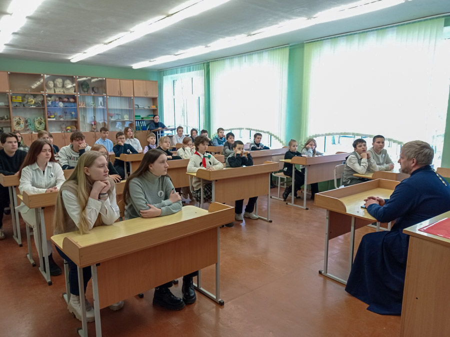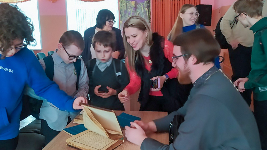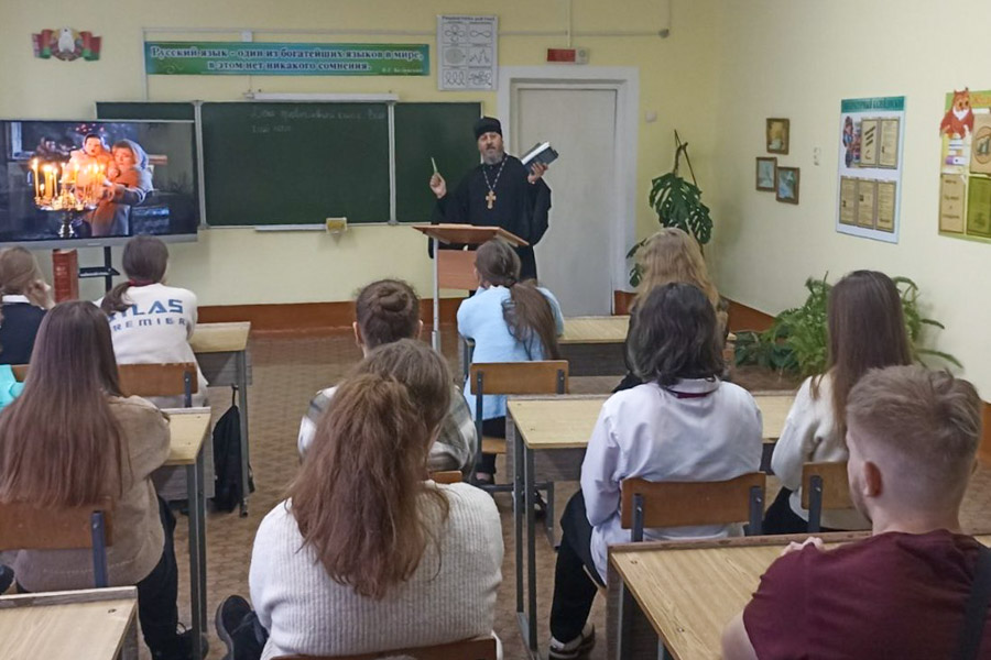 Протоиерей Василий Грек, настоятель храма святителя Николая Чудотворца в аг. Ленино, встретился со старшеклассниками ГУО «Круговец-Калининская средняя школа Дообрушского района». Состоялась беседа «О книгах православных». Священнослужитель представил вниманию ребят Богослужебное Евангелие, священные тексты которой благоговейно читают в храме стоя. А также подарил в библиотеку школы православную литературу.