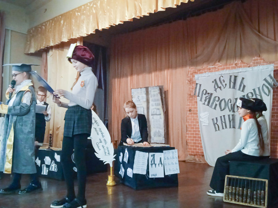 «Книжкина история» – так называлось мероприятие в гимназии г.Рогачёва, которое подготовили и провели 17 марта творческие учащиеся 4 и 5 классов под руководством заместителя директора по воспитательной работе Печёры Татьяны Петровны. Театральную постановку с интересом смотрели гимназисты и гость мероприятия – клирик прихода храма святого благоверного князя Александра Невского в г. Рогачеве диакон Никита Кулиткин.