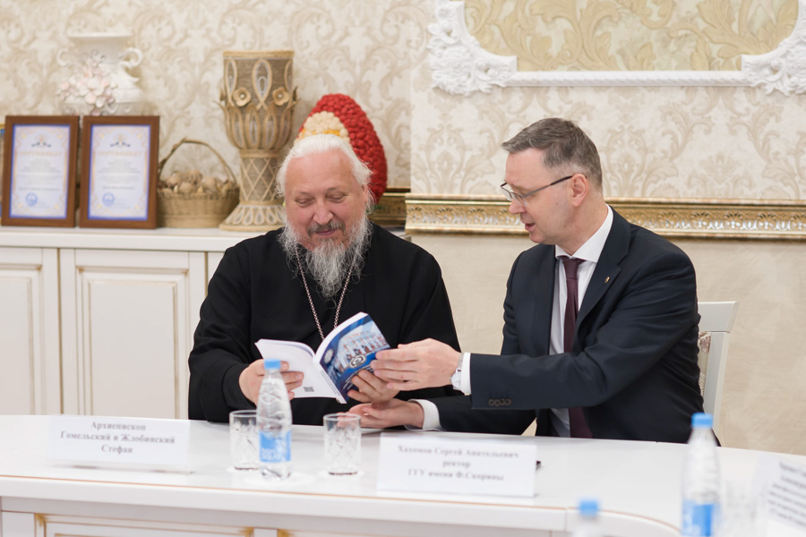 Ректор ГГУ им. Франциска Скорины Хахомов Сергей Анатольевич, в свою очередь, выразил благодарность архиепископу Гомельскому и Жлобинскому Стефану за многолетнее сотрудничество с университетом. В завершении выступления Сергей Анатольевич преподнес Владыке Стефану монографию «Кафедра ўсеагулнай гісторыі Гомельскага джяржаўнага ўніверсітэта імя Францыска Скарыны: людзі, падзеі, час (1947-2022 гады)».