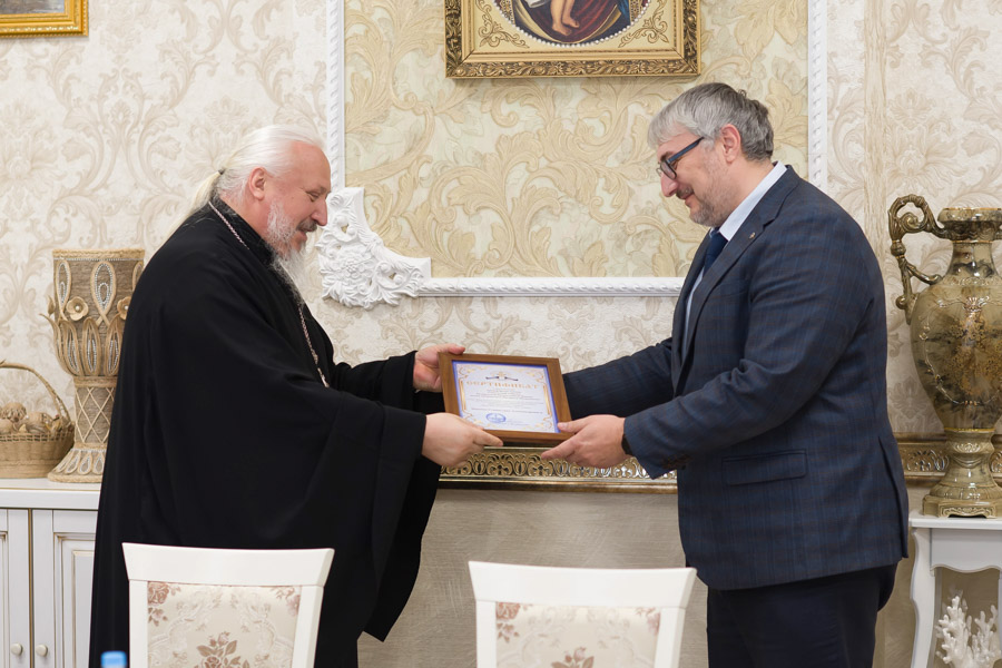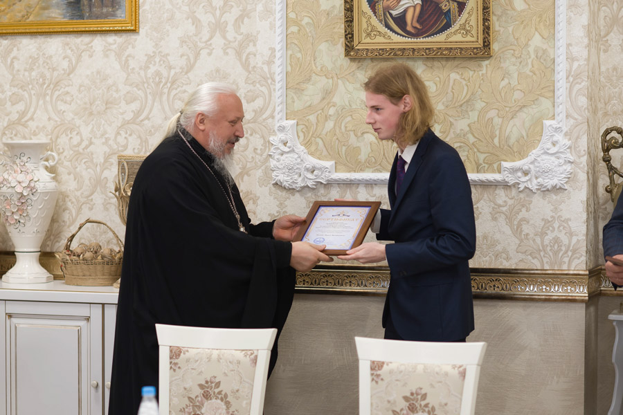 Далее архиепископ Стефан в торжественной обстановке вручил сертификат об Архиерейской премии в честь митрополита Филарета (Вахромеева) декану факультета истории и межкультурных коммуникаций Черепко Станиславу Александровичу и сертификат об Архиерейской стипендии в честь митрополита Филарета (Вахромеева) студенту III курса факультета истории и межкультурных коммуникаций Попову Ивану Валерьевичу.