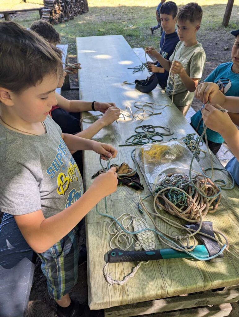 Дети освоили вязание туристических узлов и создали на память сувениры в виде браслетов.